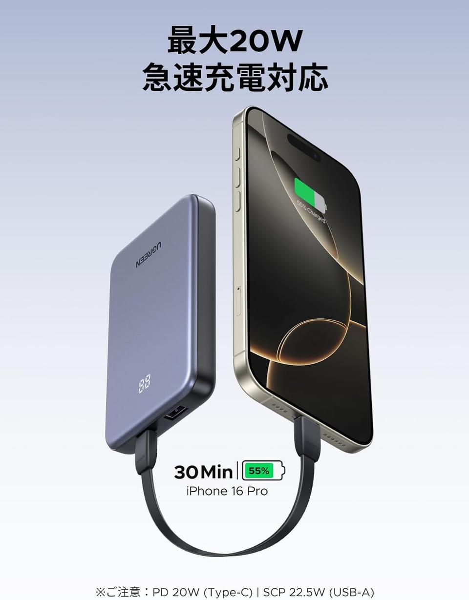 USB-CはPD20W出力、USB-Aは最大22.5Wに対応し、iPhone 16 Proでは30分で約0〜55%の急速充電が可能。本体への充電も20W入力が可能で、約3時間で0〜100%まで回復します。