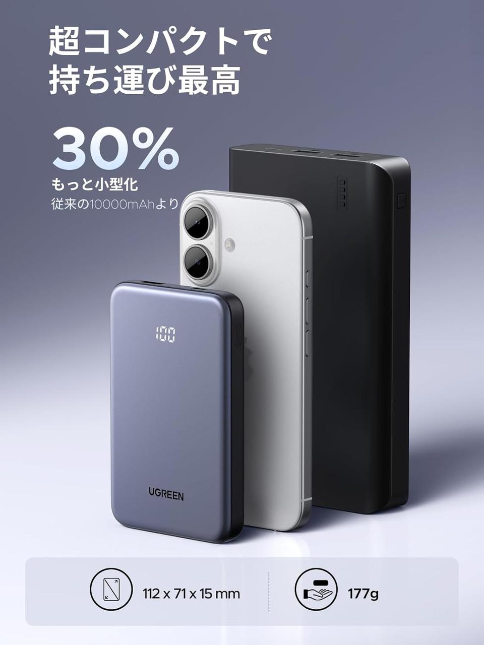 UGREEN史上初の小型化を実現! 10000mAhの大容量でも持ち歩きやすいサイズ感で1,000円台に