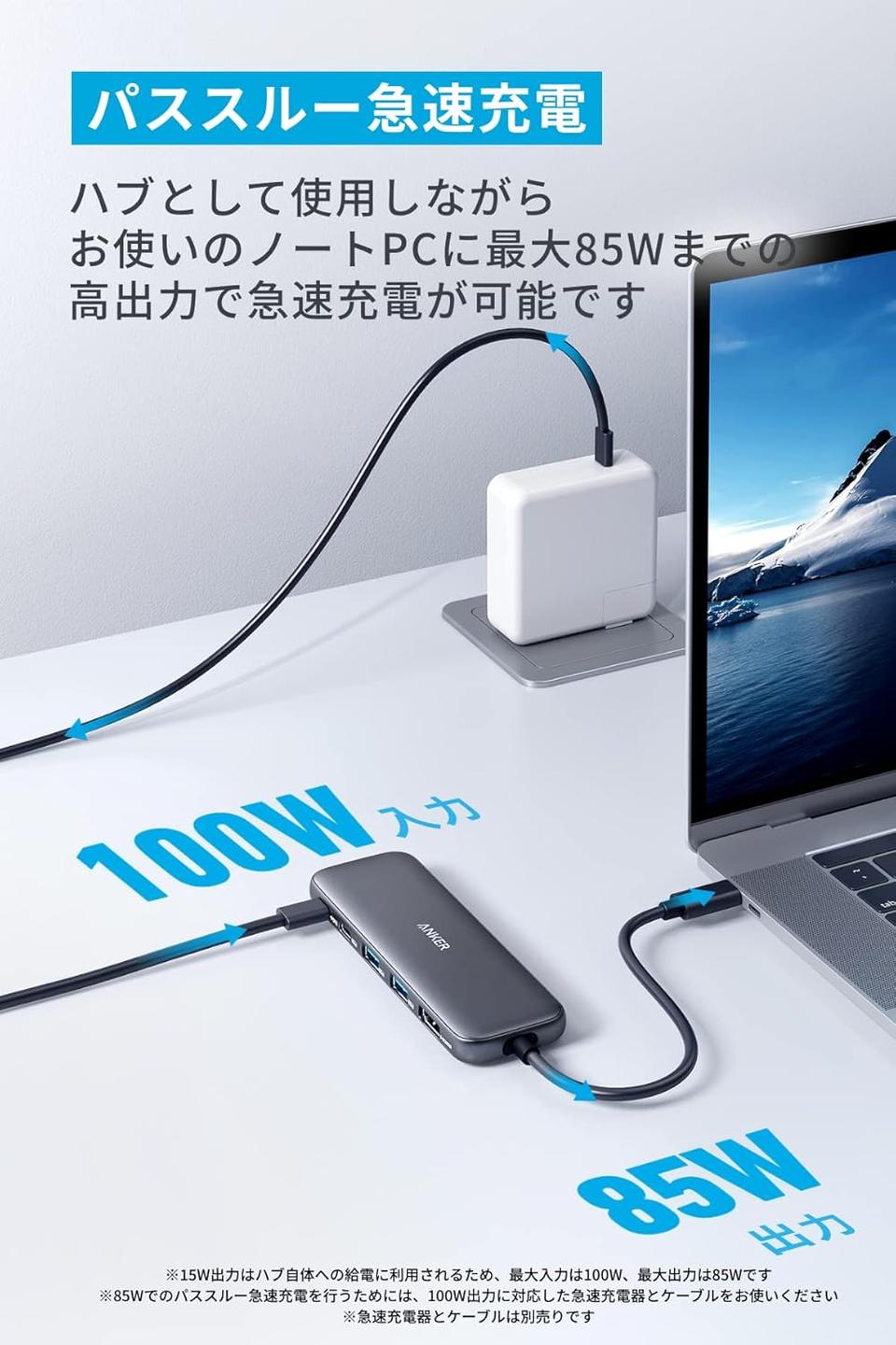 USB-Cポートは最大85Wのパススルー急速充電に対応。ハブ使用中でもノートPCをしっかり充電でき、長時間作業でもバッテリー切れの心配を軽減します。