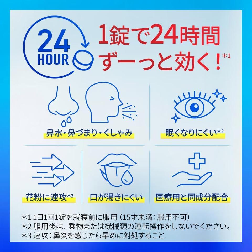 第2世代抗ヒスタミン成分「エピナスチン塩酸塩」を最大量配合(20mg)したこの薬、なんと1日1回寝る前に飲むだけで24時間しっかり効果が持続!鼻水・鼻づまり・くしゃみの3大症状にアプローチしてくれます。