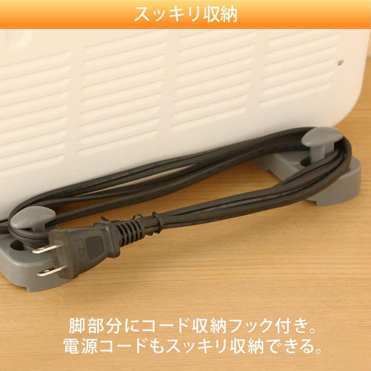操作は本体上部のスイッチを回すだけと直感的。転倒時電源オフ機能を備え、安全面にも配慮されています。コード収納フック付きで、使わない季節もスッキリ収納可能です。