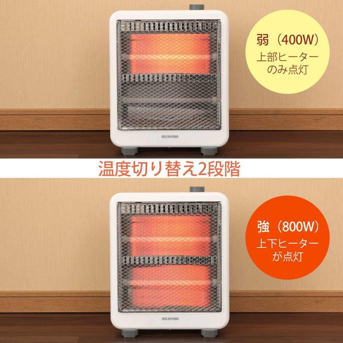 電源を入れるとすぐに暖かさを感じられるのが本機の強み。温度切り替えは2段階で、弱(400W)は上部ヒーターのみ点灯、強(800W)は上下ヒーターが点灯します。朝の身支度や料理中など、短時間で冷えやすい足元を効率よくカバー。シンプルな構造のため、無駄な待ち時間なく必要な場所を暖められます。
