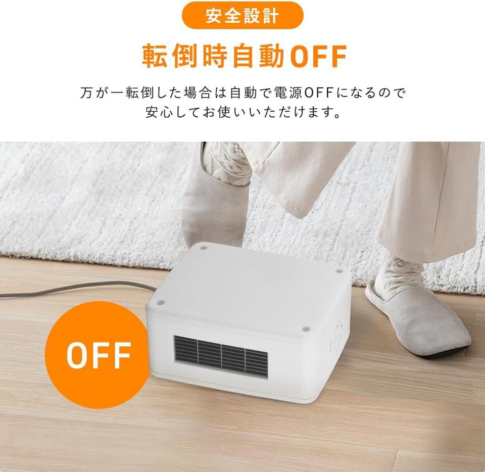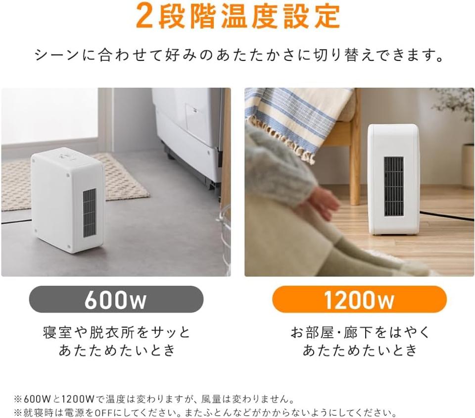 出力は600W/1200Wの2段階切替に対応し、短時間で足元を暖めたいときから、部屋や廊下をしっかり暖めたいときまで柔軟に対応。スリムながら1200Wの大風量で、必要な場所を効率よく暖房できます。