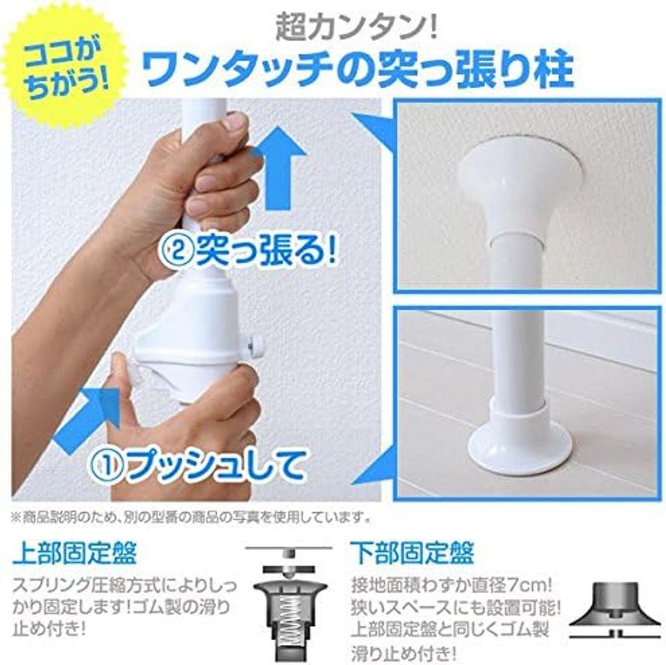 下段は二連掛けで風通しを確保でき、合計30kgまでの布団干しにも対応。支柱はボタンを押して上げるだけのオリジナル突っ張り機構で、ネジや工具は不要です。