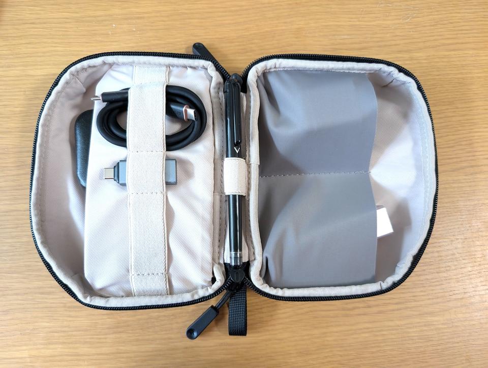 大きさは24.4×14.4×厚み6.3 cmとガジェットポーチにしては少し大きいものの、収納力を考えるとむしろコンパクトに感じられます。撥水対応の素材で中身が濡れないのも安心。