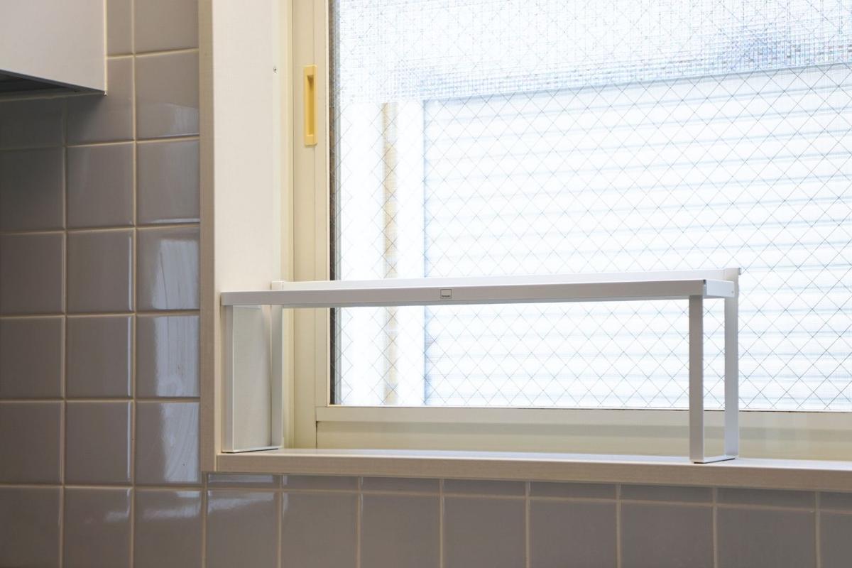 棚板の番(つがい)がある側、背面を前にして設置しているのは、手やブラインドが当たってうっかり落としたり、猫ちゃんがイタズラして落としたりするのを防止するため。