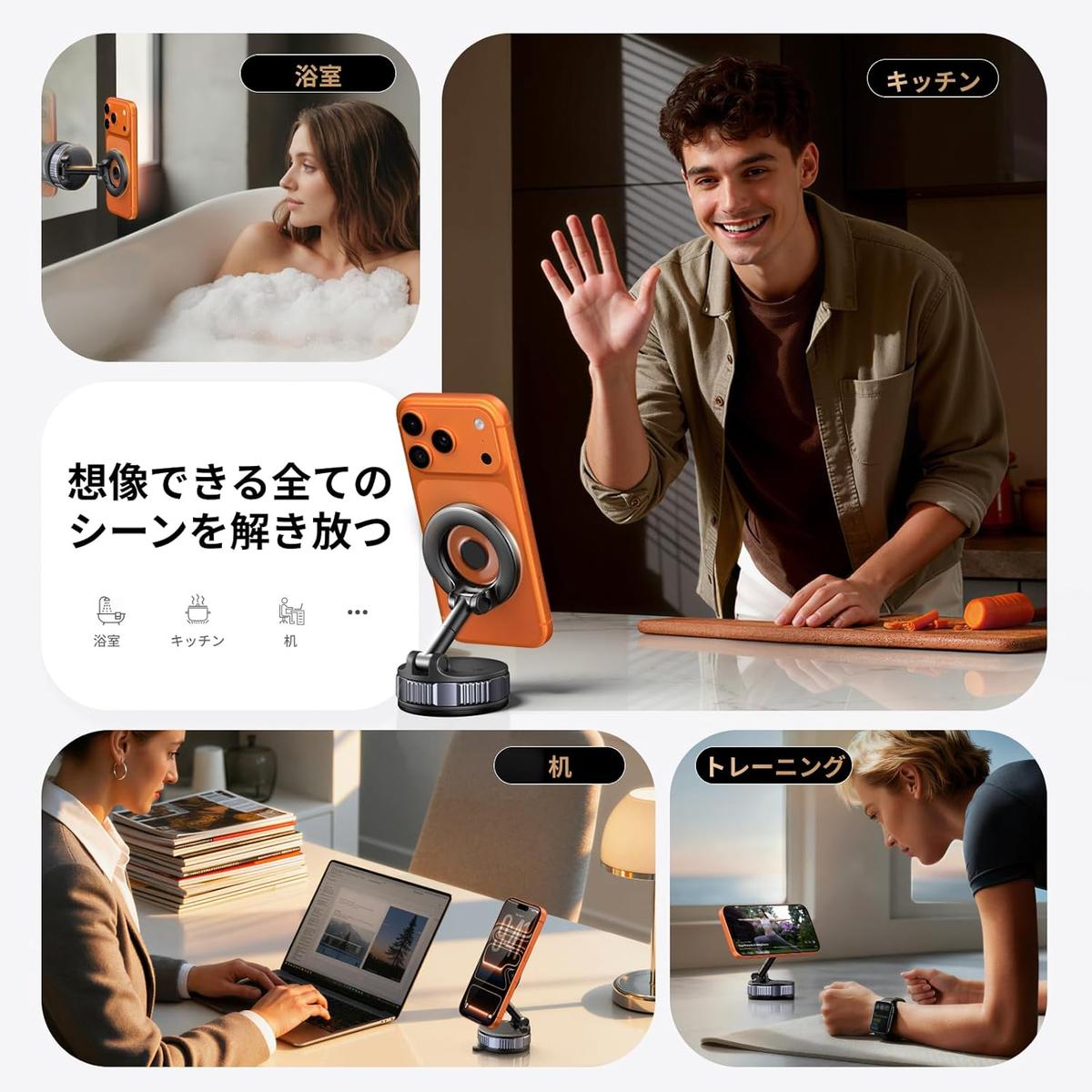 MagSafe対応のため、スマートフォンを近づけるだけで着脱可能。車載ホルダーとしてだけでなく、デスクやキッチンなど車内外で使える2役仕様なのも◎です。