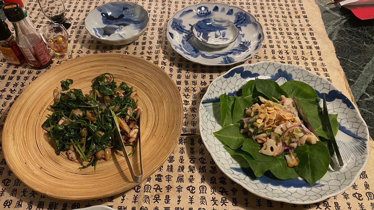 鶏肉とパクチーのナンプラー炒め、レンコンの梅肉あえ(りっちゃんの梅干を使用)。