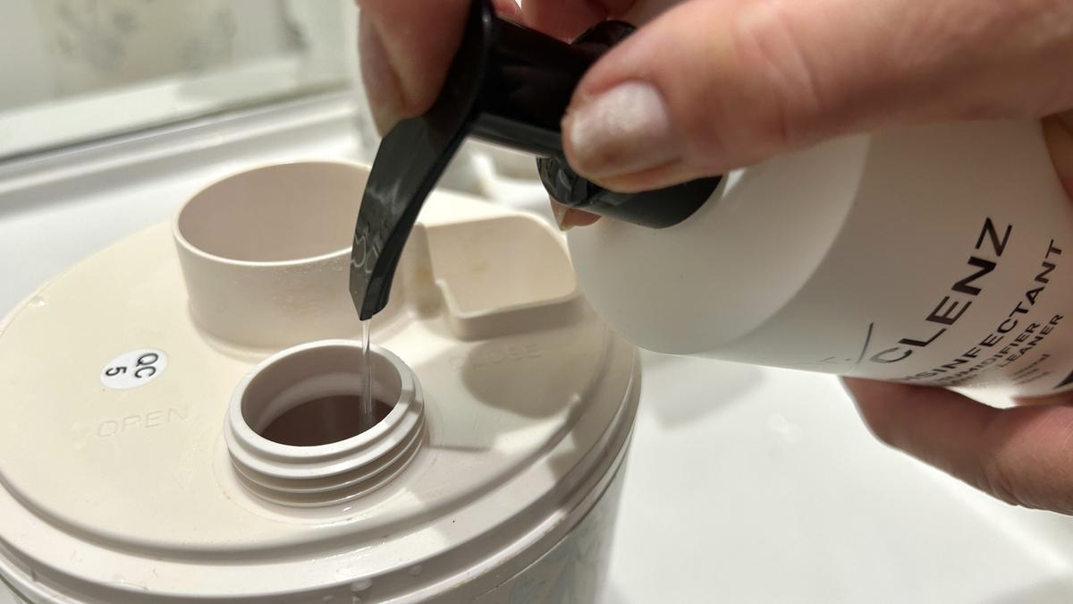 加湿器の水タンクに水を入れたら、2Lの目安に対して3プッシュほどを入れるだけ。