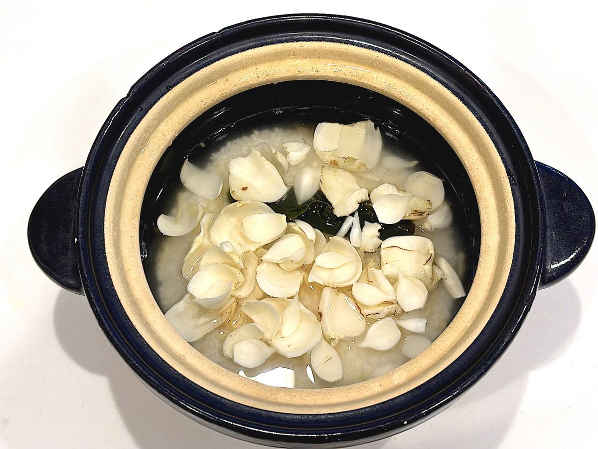 3. 米をザルにあげて水気を切り、土鍋に入れて、水と酒、塩を入れさっと混ぜる。だし昆布、しょうが、百合根をのせる。