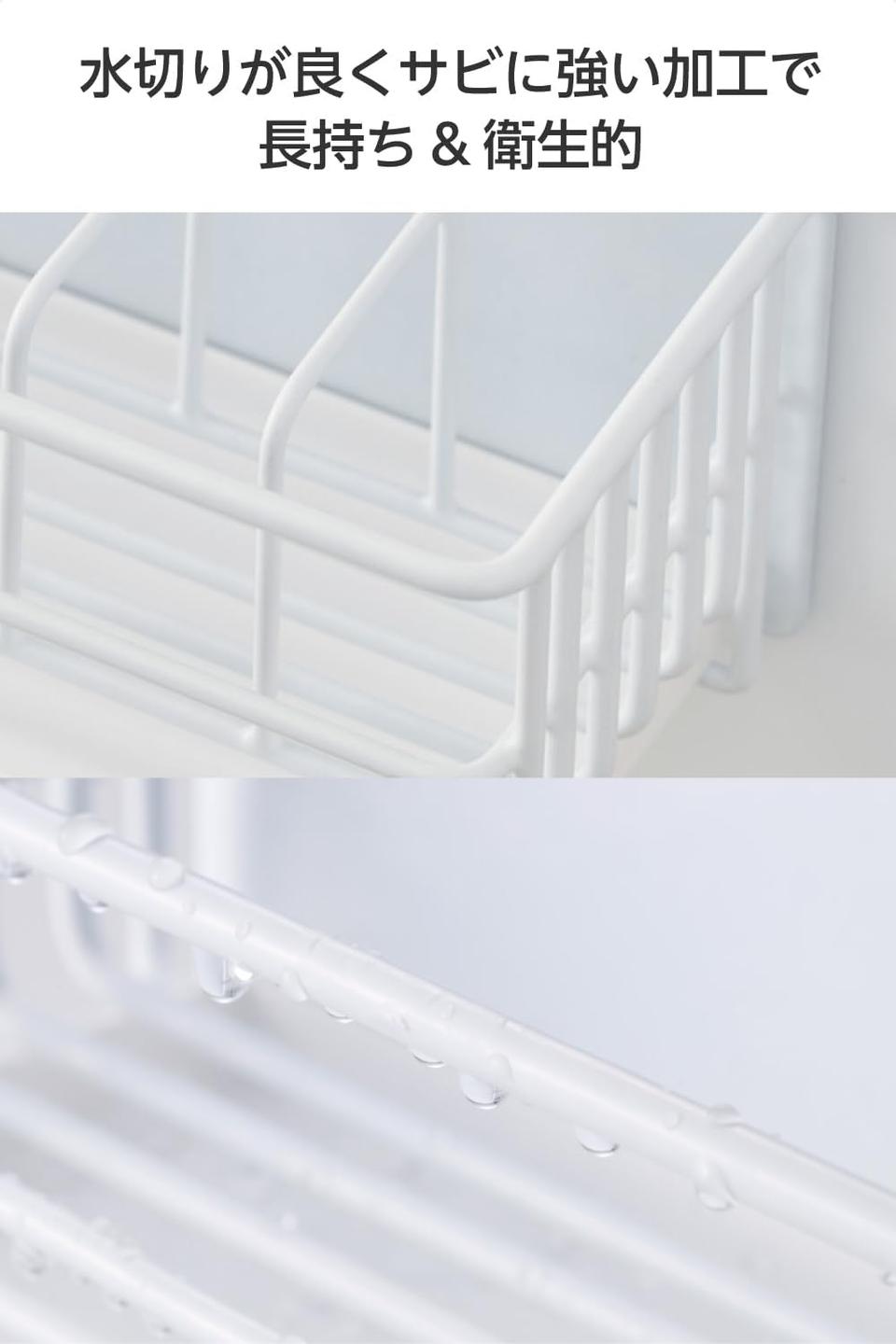 丸いワイヤー構造で水が溜まりにくく、付属の水受けトレーはスライド式で片手でサッと取り出せます。溜まった水滴をすぐに捨てられるから、ぬめりがちなシンク周りのお手入れが格段にラクになりますよ!