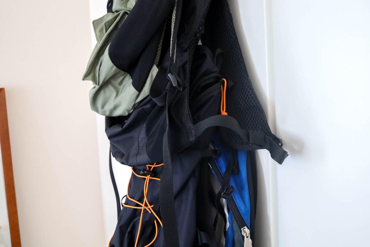 フックとフックの間はそこまでなく、リュックを重ねてかけることになるため、すべてのフックを使用すると結構厚みは出るかも。