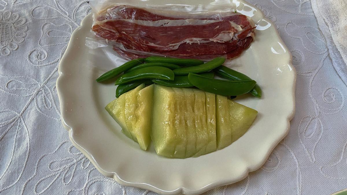 イベリコハムとスナップエンドウとメロン、