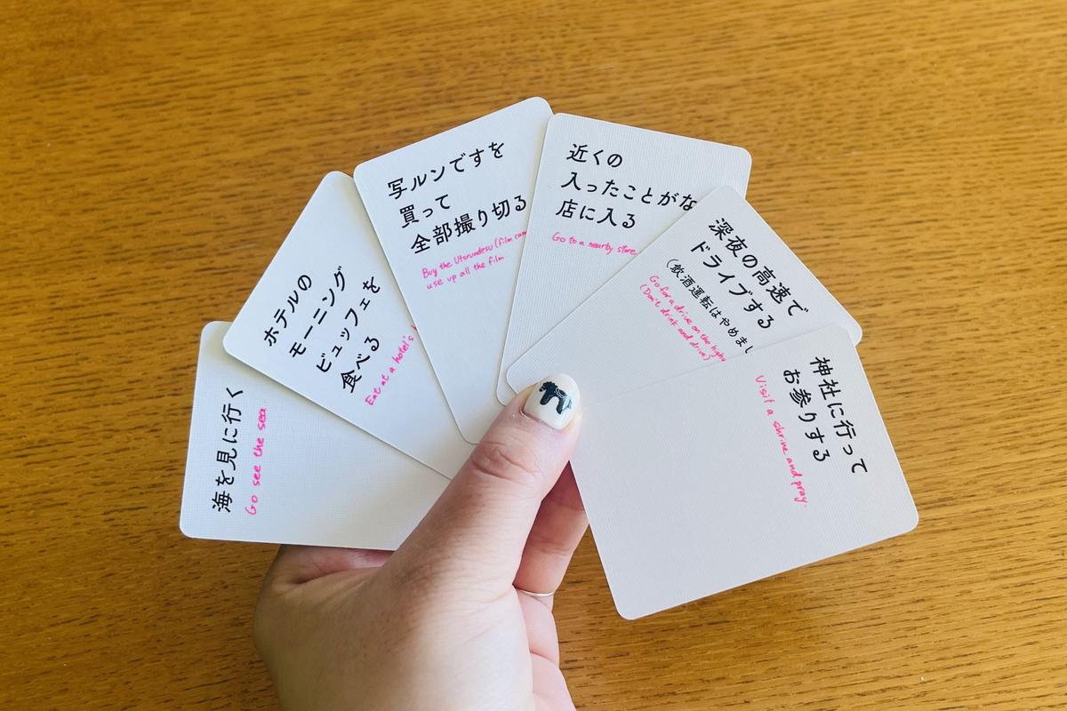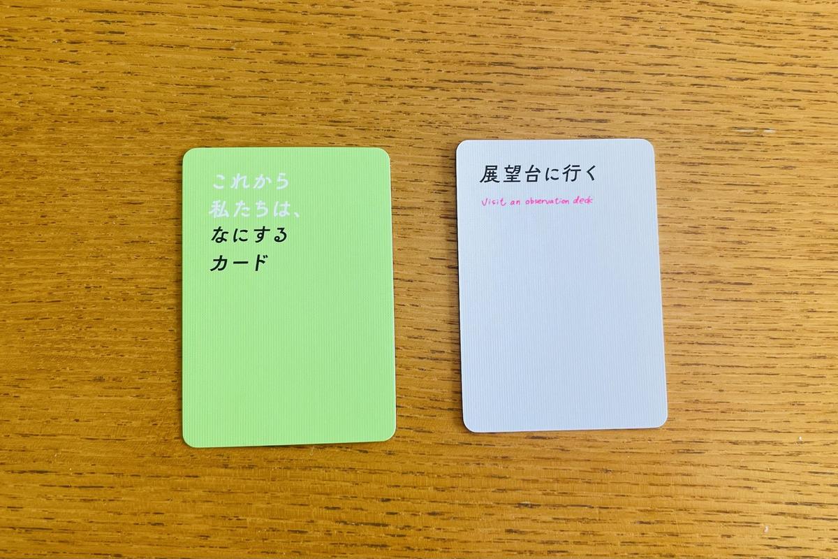 やり方はとてもシンプル。「なにするカード」をみんなで回しながら、手札を捨てていくだけ。それだけで、お互いの「これからやりたいこと」が自然と重なり合い、ひとつの計画が浮かび上がってきます。