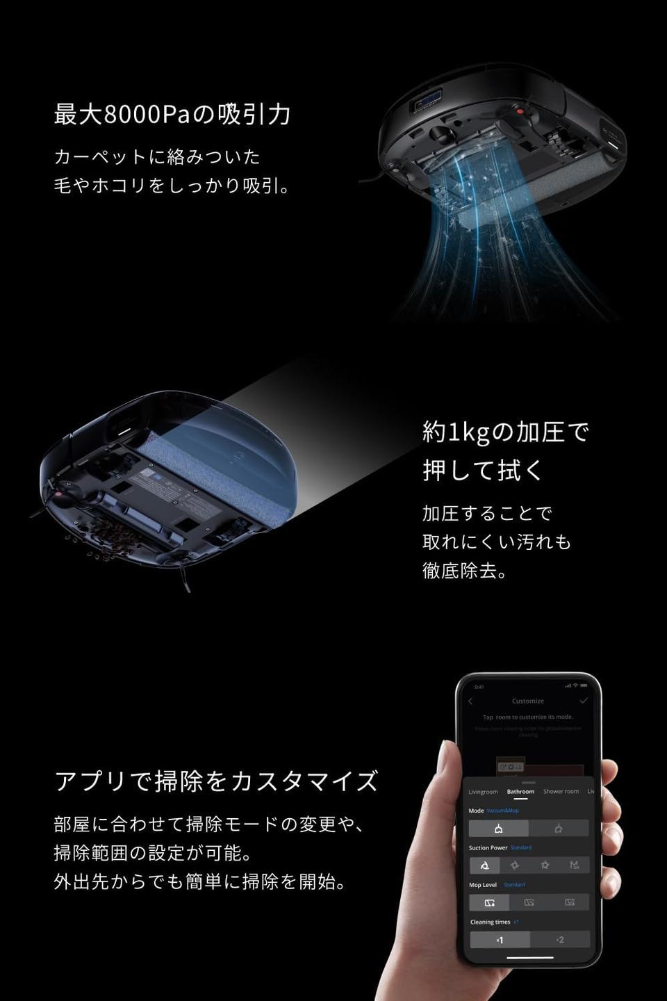 最大8000Paの吸引力でカーペットの奥のホコリまでしっかり吸引。まさに掃除機と水拭きモップの良いとこ取りです。