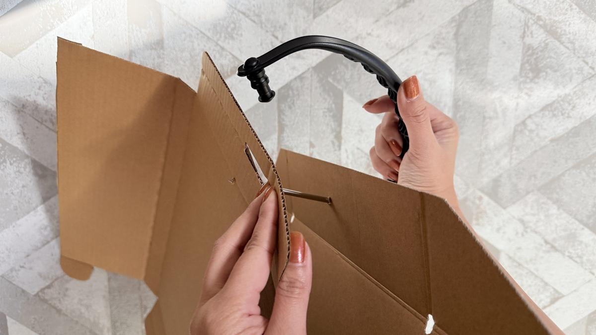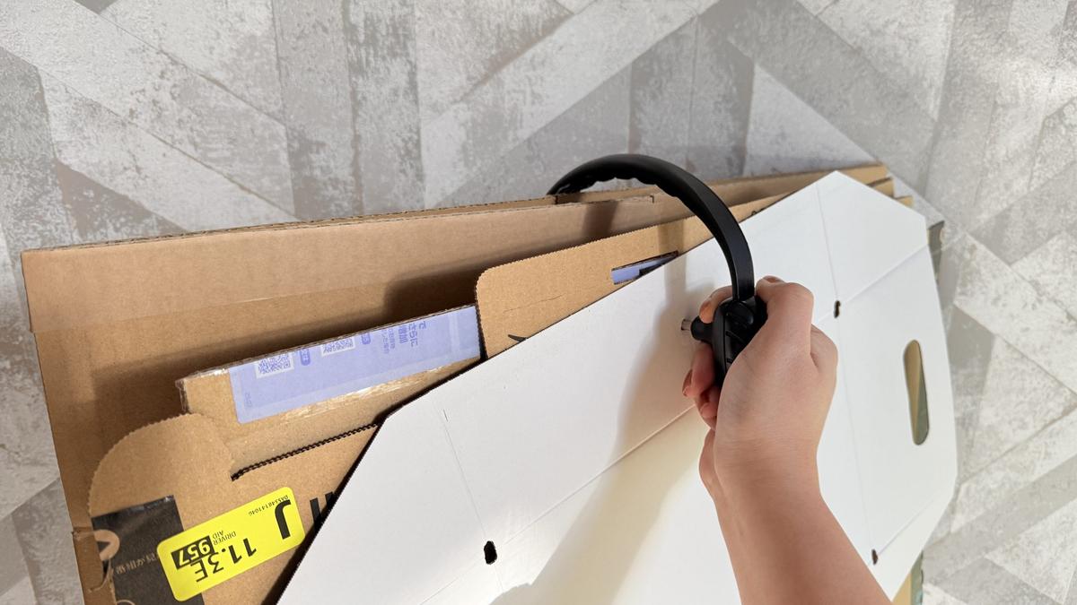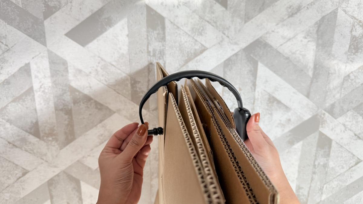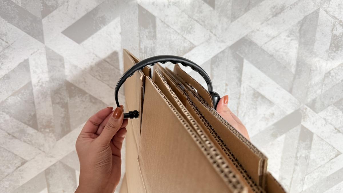 その後、本体を引っ張り針を抜くと、ダンボールに紐が通ります。