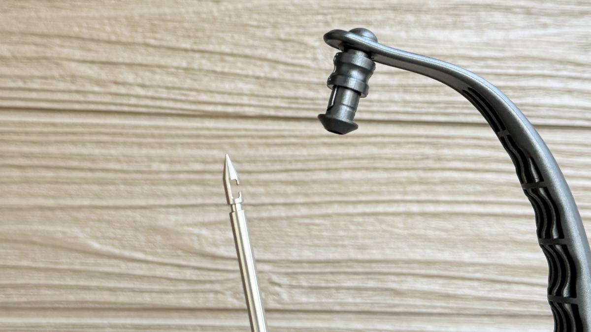 まずは針の先端部分にある切り込みに紐をセット。