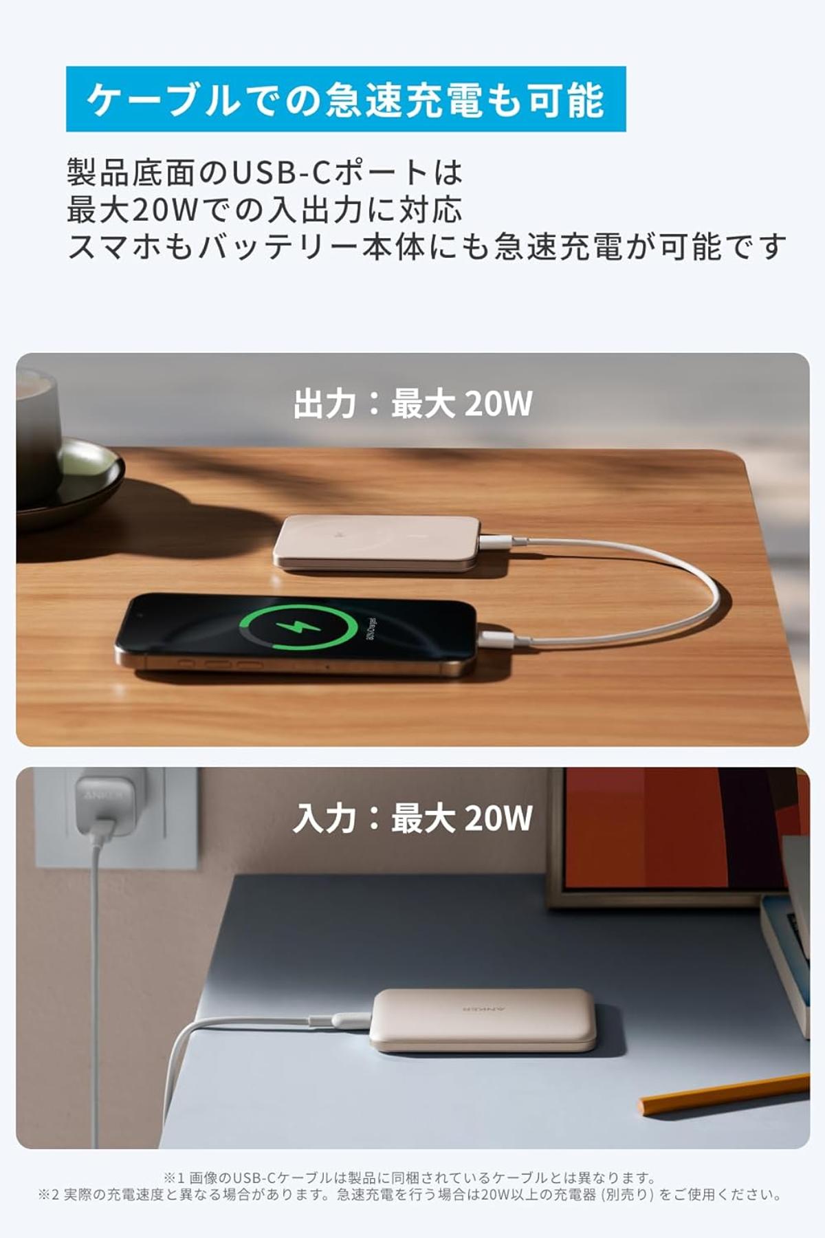 Anker独自のWireless PowerIQと温度管理機構により、充電効率と放熱性を両立。底面のUSB-Cポートは最大20Wの入出力に対応し、バッテリー本体・スマホ双方の急速充電にも対応します。