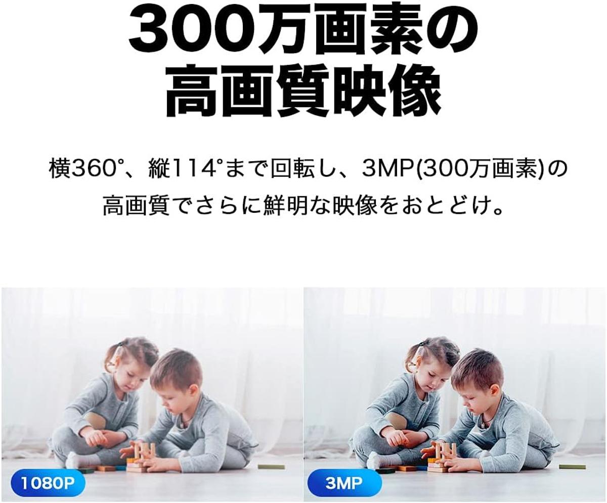 本製品は、300万画素の高精細映像で室内を確認できる見守りカメラ。カメラは横360度、縦114度まで回転するパン・チルト機能を搭載し、死角ができにくい設計になっています。
