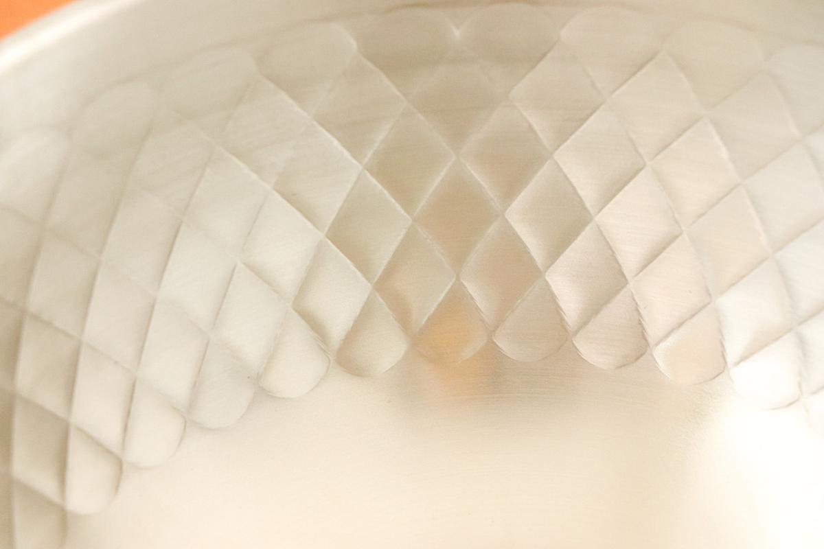 なだらかな凹凸がついており、お米を軽く研ぐだけで、余分な汚れやヌカを効率よく落としてくれるのだそうです。