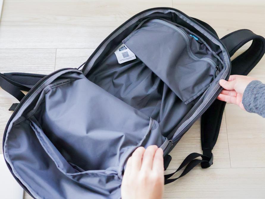 また、内側にはメインコンパートメントとは別にクッション性のある仕切り付きのスペースが用意されており、大型のノートPCやタブレットなども余裕で収納可。