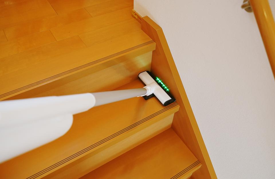ソファの下や家具の脚まわり、階段など、細かく動かしたい場所や狭い場所へもスルリと入り込んでくれます。結果として、「ここは後でいいや」とスルーしていた場所にも自然と手が伸びました。気軽さが行動量を増やしてくれる感覚ですね。