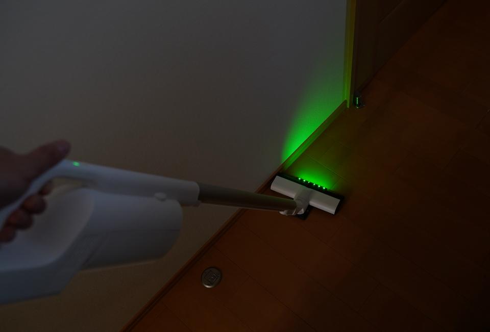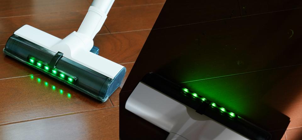 ゴミを見やすくする効果のある緑色LEDライトが付いているのも今どきの仕様ですね。暗がりでも部屋の照明をつけずに、掃除に挑めるのが気が利いています。