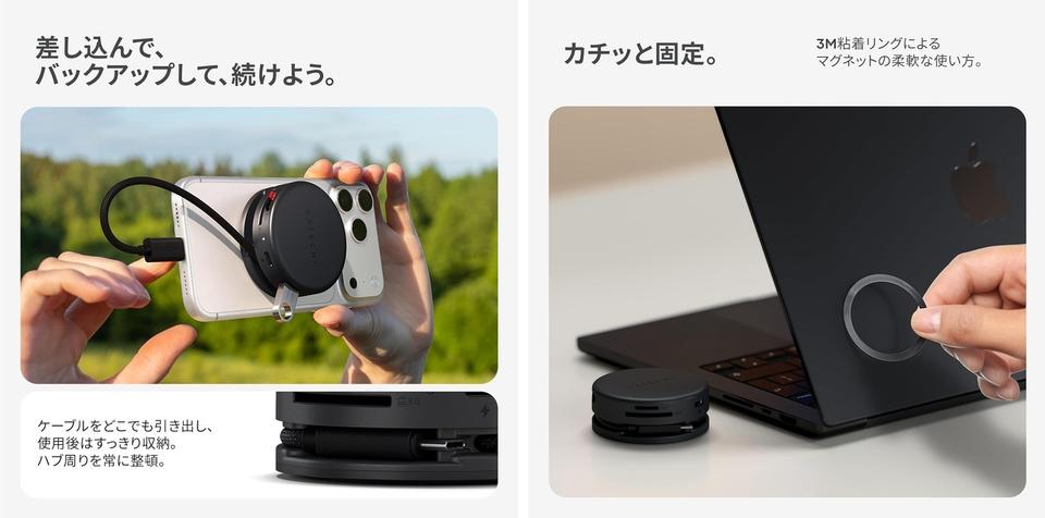 最後に挙げたいのは、デスクとバッグで「省スペース」が叶う点。巻き取り式USB-Cケーブルと磁石マウントによって、ケーブルが本体にシュルッ、ピタッと収納できる独自設計です。