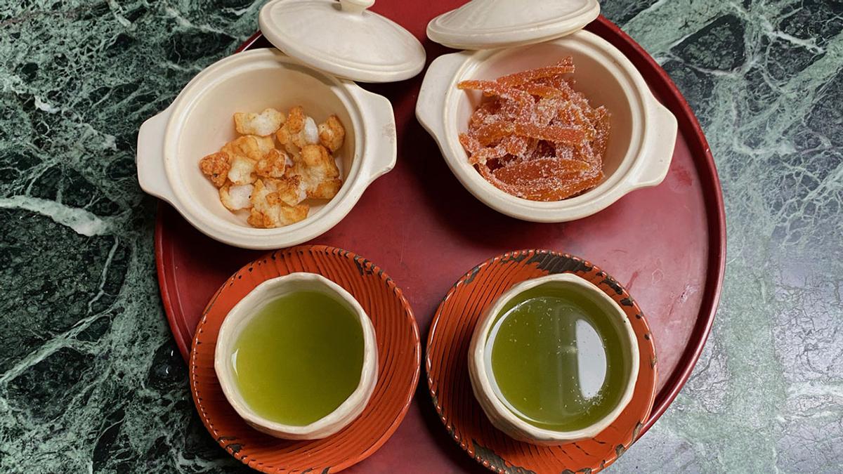 日本茶と煎餅と橙皮のピール。