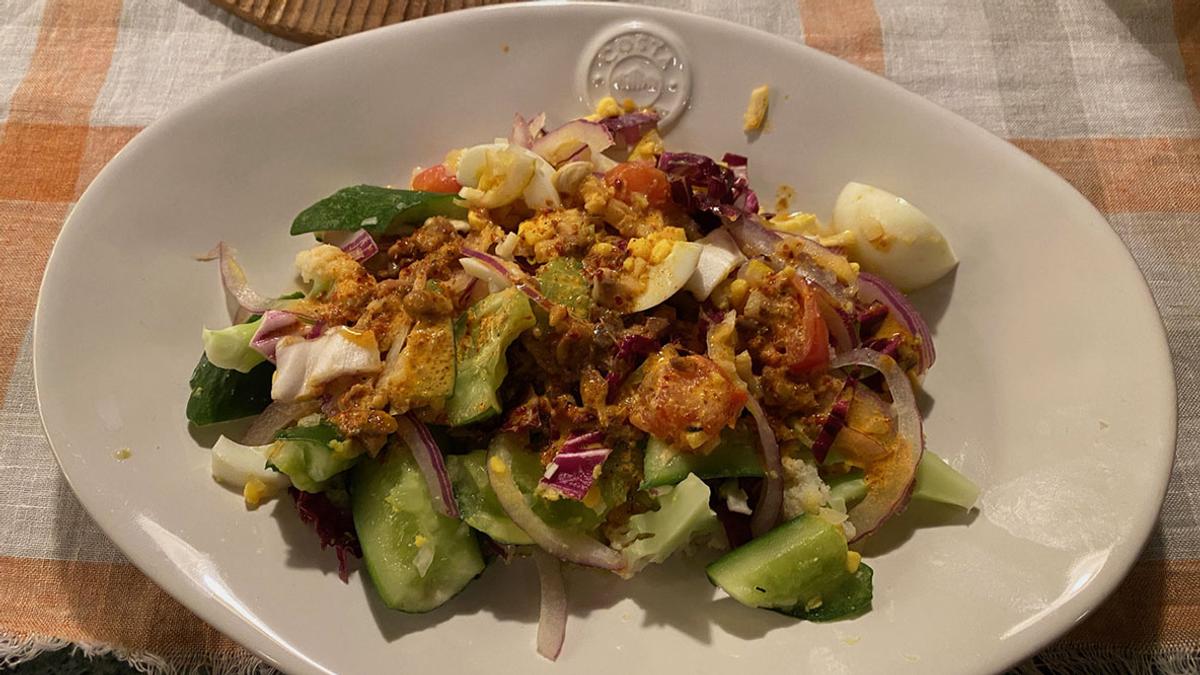 きゅうりとアーリーレッド、ゆで卵のハリサとマヨネーズmix和えサラダ。