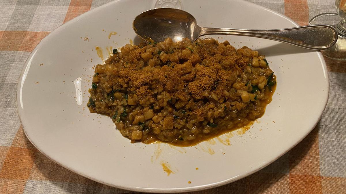 昨日に引き続き「コウイカ」料理を致します。本日はリゾット。今日のイカの墨袋からはあんまりイカ墨が取れなくて、焦げ茶色のリゾットになりました。仕上げに「カラスミ粉」をサラサラと。ほほう、ほほう、イカ墨って美味しいものですね。なんとなく敬遠していたけれど、これからは積極的に食べたいと思います。