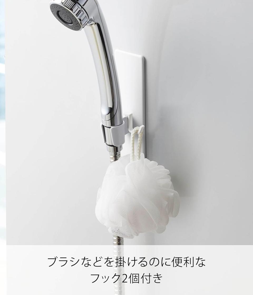 便利なフック2個が付属しており、ボディタオルやブラシ、掃除用アイテムなど、ちょっとした小物収納にも活躍するので、シャワー周りをすっきり整えたい人にぴったりです。