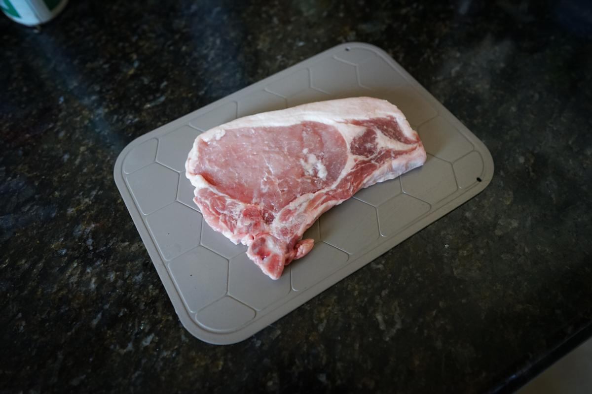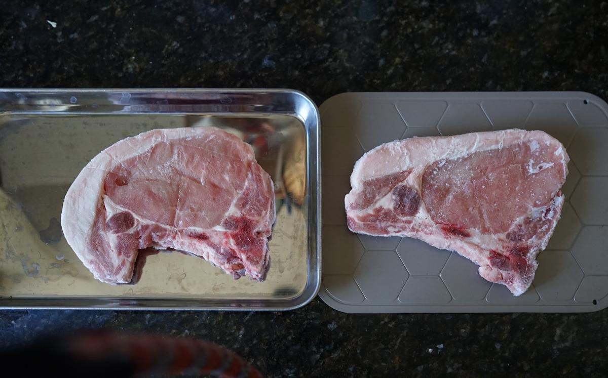 トレイに置いた肉はまだカチカチでしたが、解凍プレートに置いた肉はだいぶ柔らかくなっていました。
