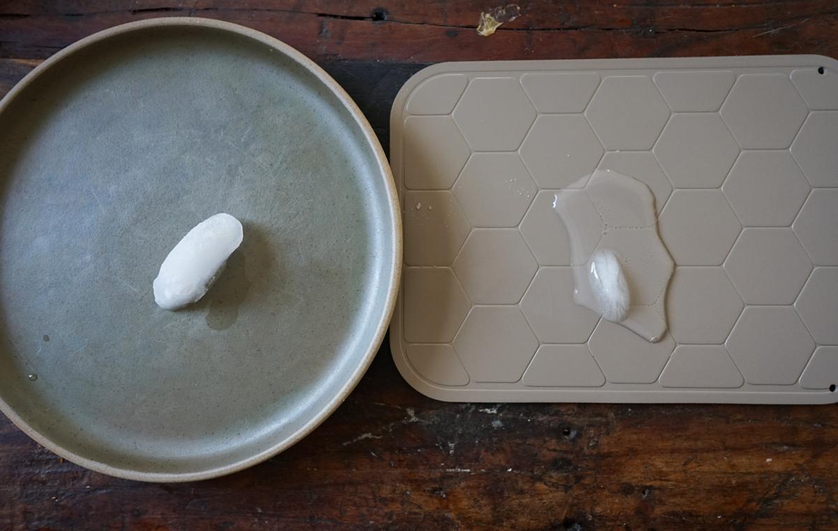 解凍プレートに置いた瞬間から氷が解け始め、2分後には皿に置いていた氷は全く溶けていないのに対して、解凍プレートに置いた氷はほぼ水状に。