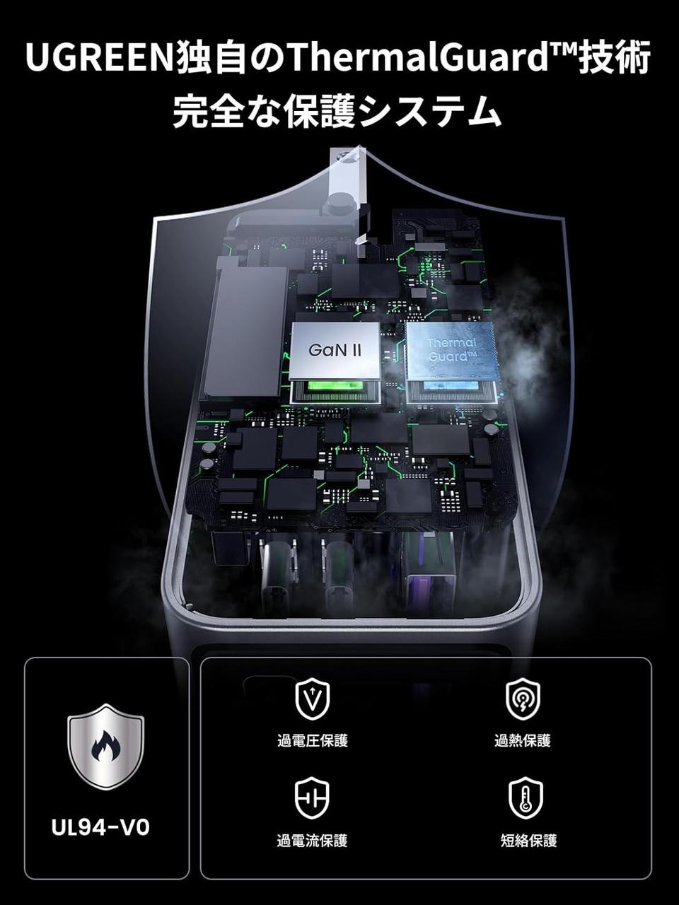 UGREEN独自の温度検知制御技術「Thermal Guard」を搭載。ミリ秒単位で温度を検知し、過熱や過充電を防いでくれるから、大切なデバイスも安心して充電できます。耐火性・難燃性の高級PVC素材を使用しているのもポイント!