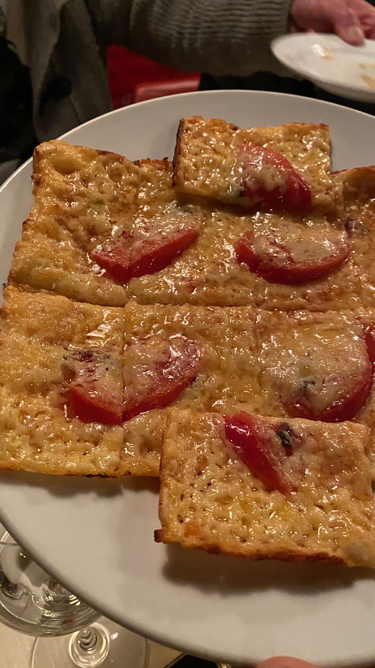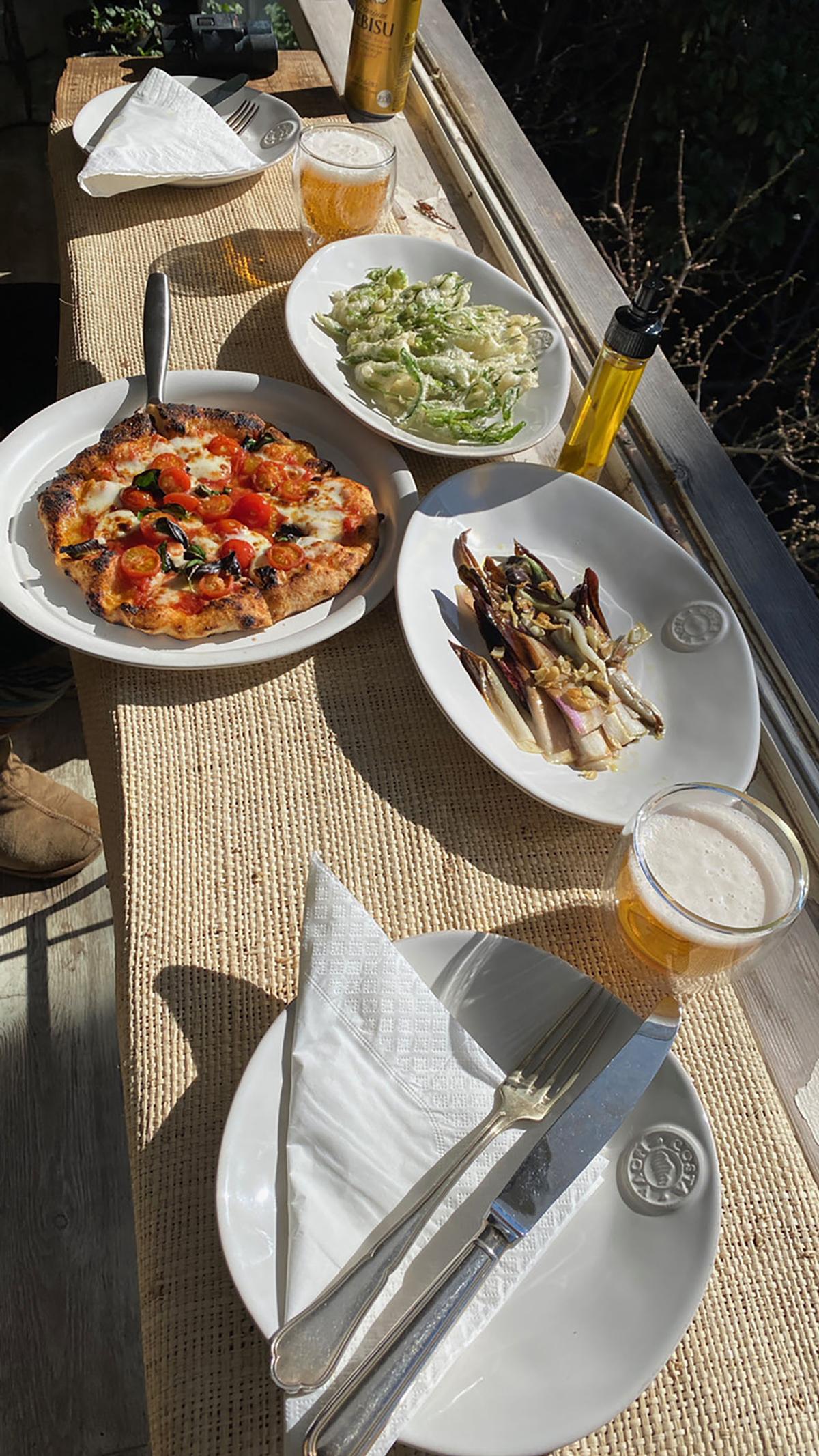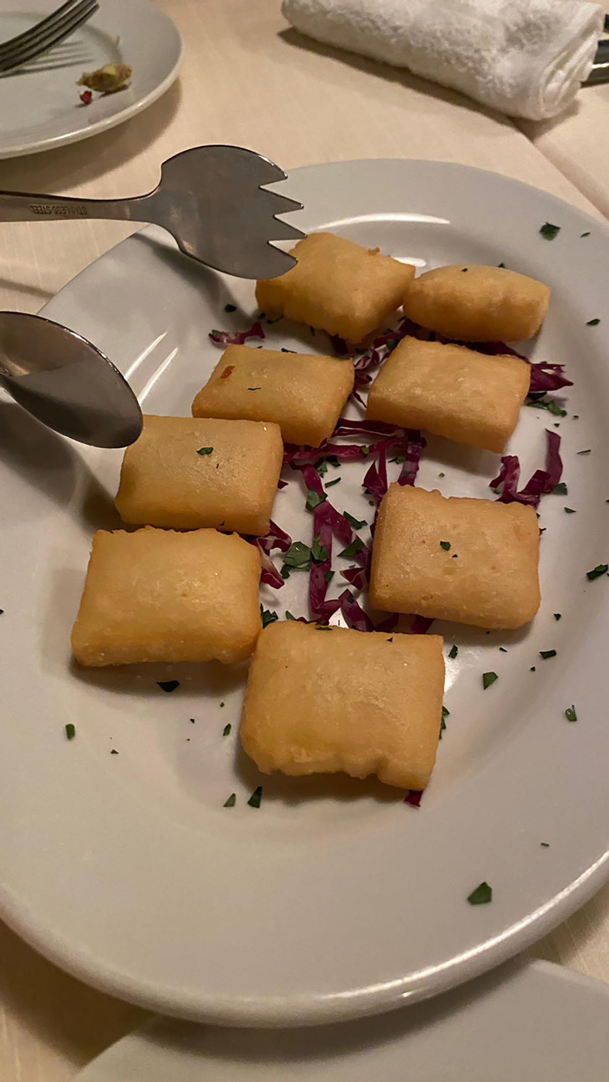 プンタレッレのフリット、ラディッキオのソテー、Pizza マルゲリータ、cafe、チーズ、イチゴ。