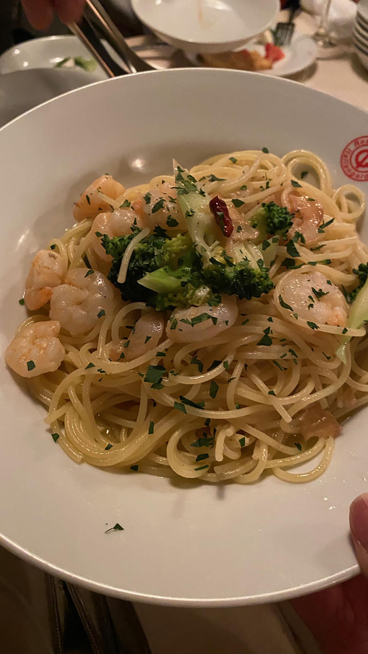 海老とブロッコリーのペペロンチーニスパゲッティ、ポークピカタ、チーズ盛り合わせ。