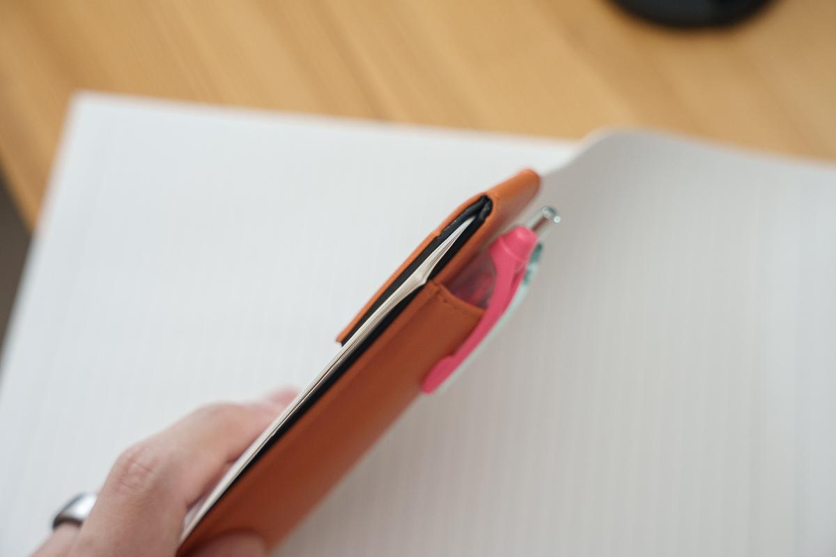 これまでは、適当にメモ帳に挟んでペンを持ち歩いていましたが、見た目もよくないし、移動中に外れてどこかへ行ってしまうことも多々……。