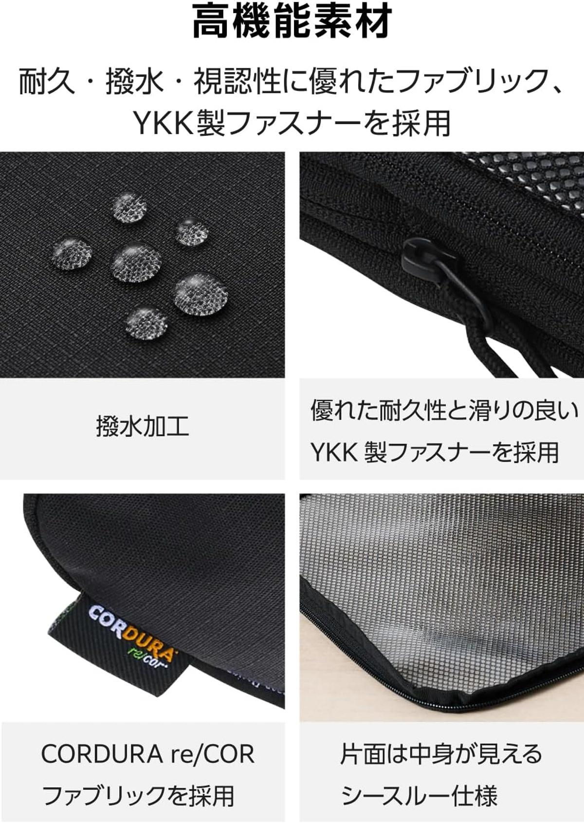 表生地にはテフロンコート加工が施され、汚れにくく撥水性にも優れるのも◎。YKK製ダブルファスナーにより開閉はスムーズで、片面にはシースルー窓を備え、ファスナーを開けずに中身を確認できる点も実用的です。