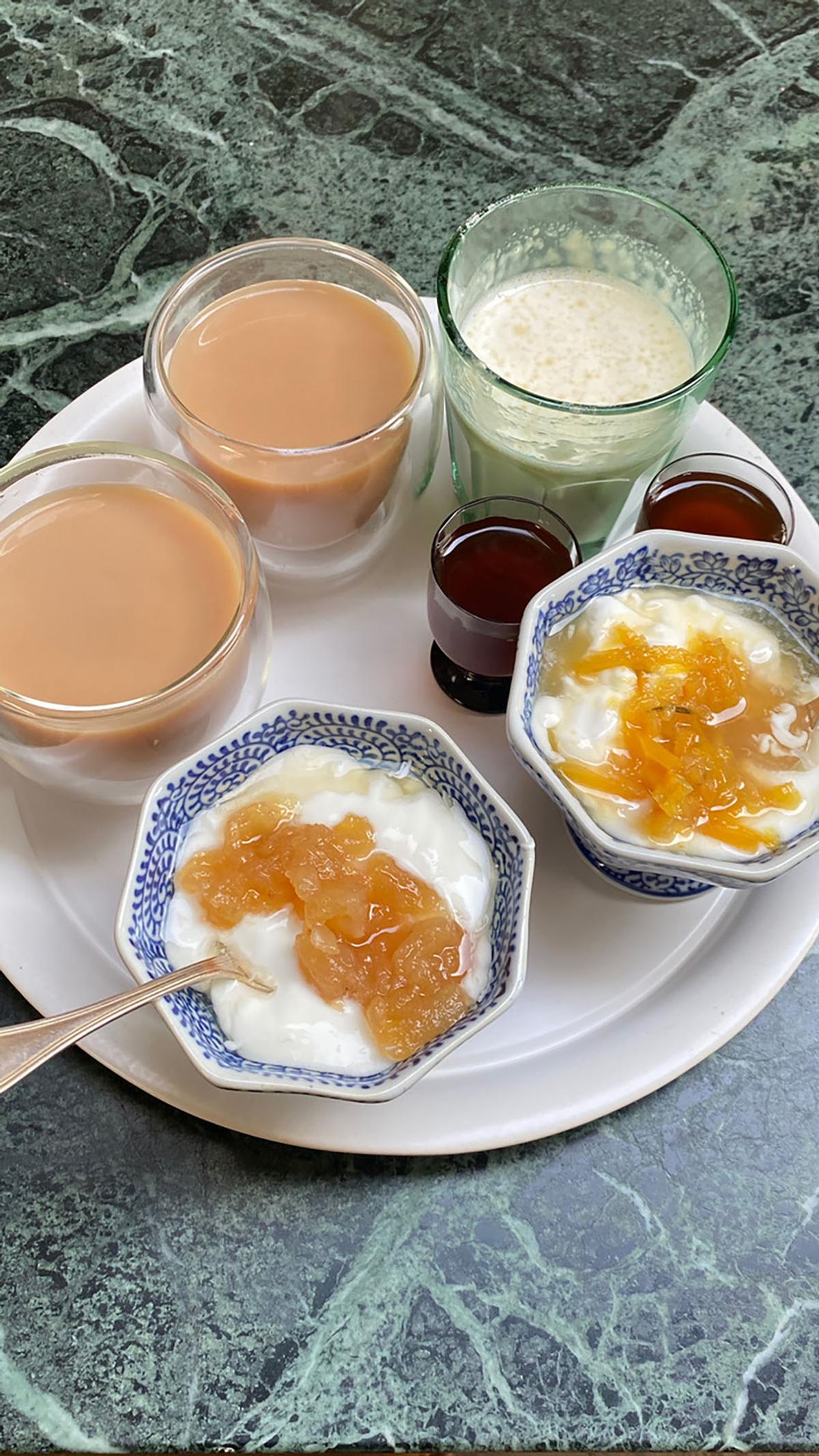 ミルクティ、プロテイン、今日の元気、ヨーグルト+林檎ジャム。