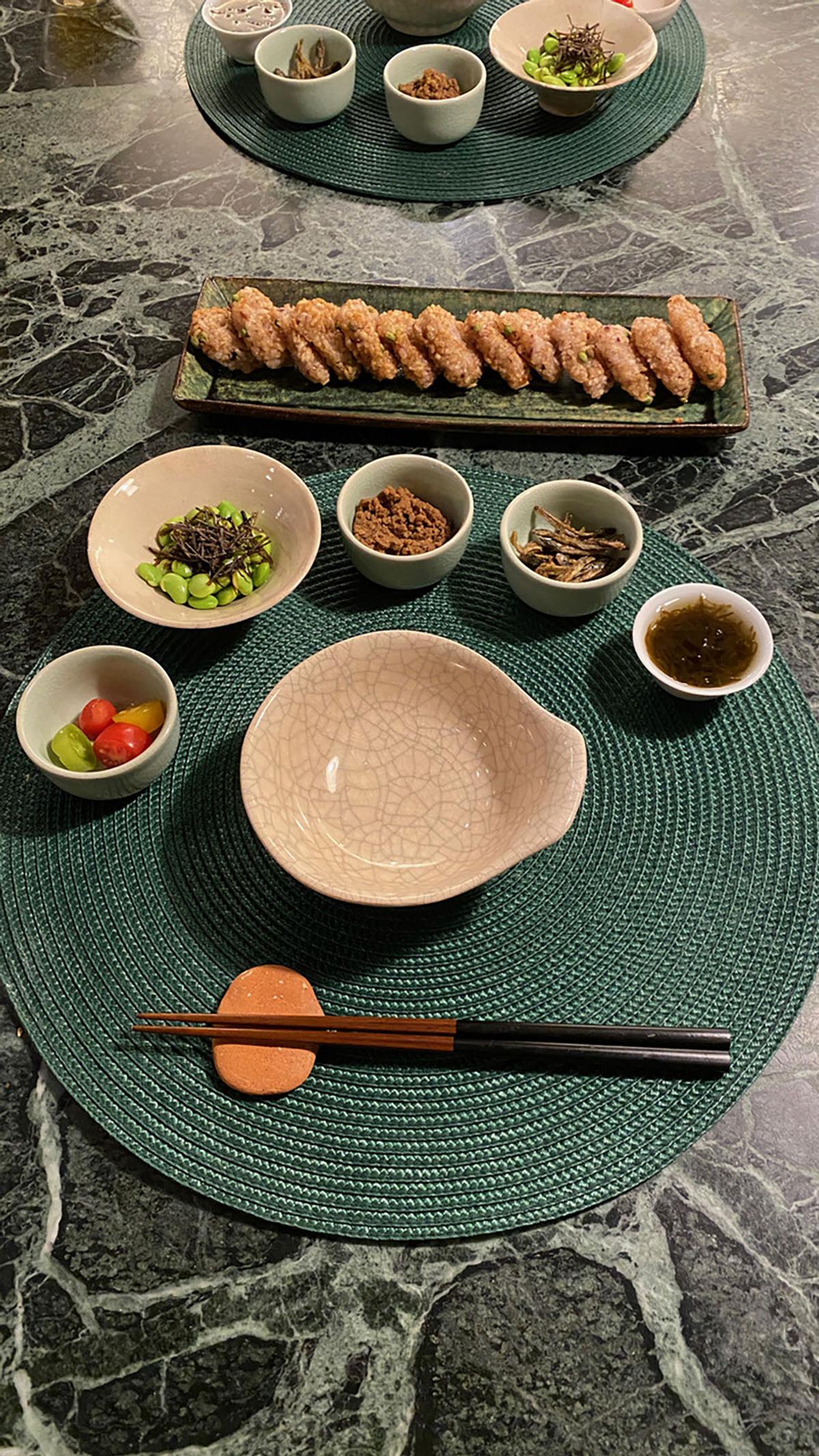 ちまちまと並べた小鉢にはこんなものが入っています。トマト/枝豆と小松昆布/肉味噌(能登半島・穴水町たんぽぽファーム)/田作り/もずく酢/ちびの焼きおにぎり。