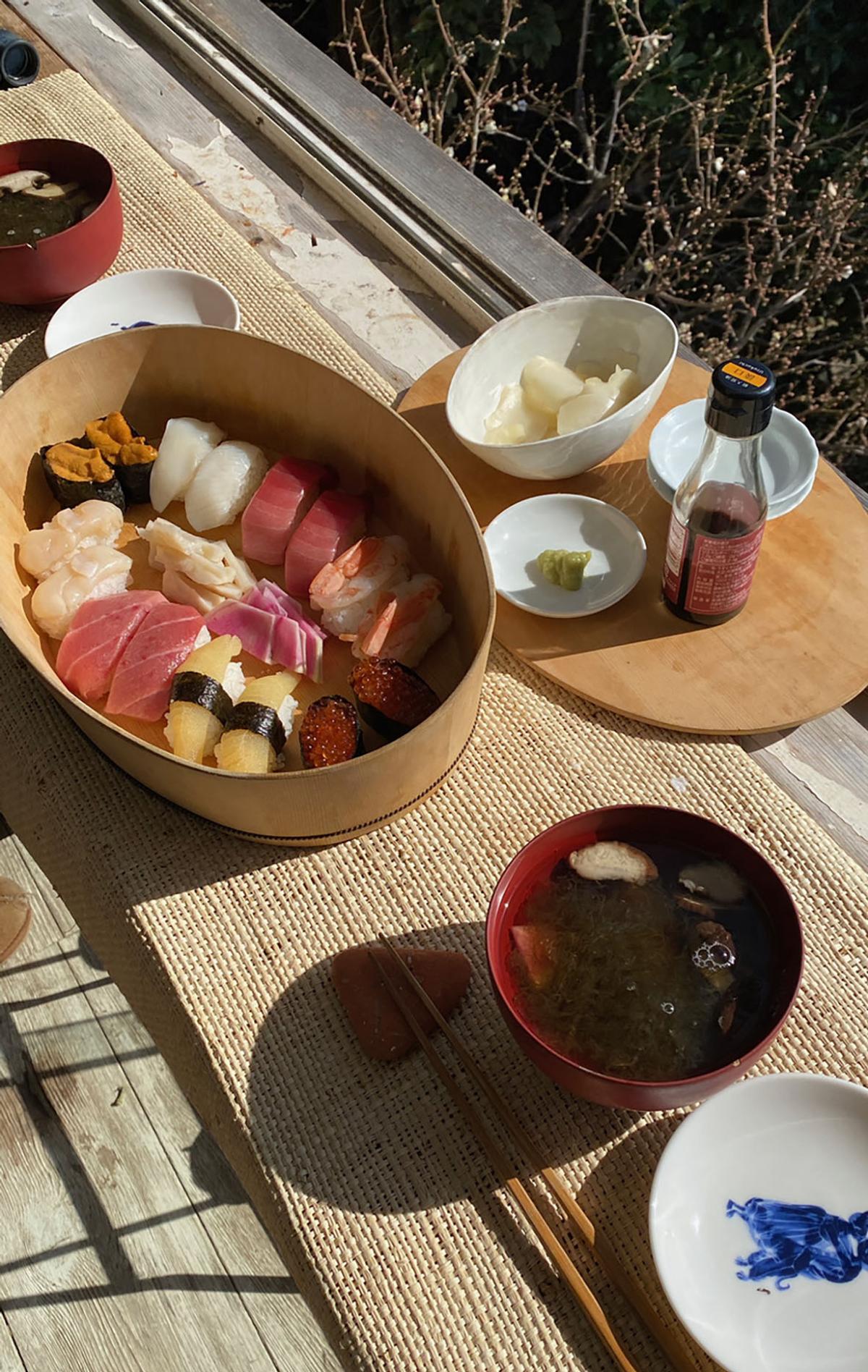 鈴木水産の握り寿司(16貫/2人分/1880円)を食べる。マグロ中トロ、マグロ赤身、数の子、イクラ、エビ、イカ、ホタテ、ウニ。寿司、美味しいですよ。大慌てで作った椎茸ととろろ昆布のお吸い物&蓮根&紅芯大根、ガリ。
