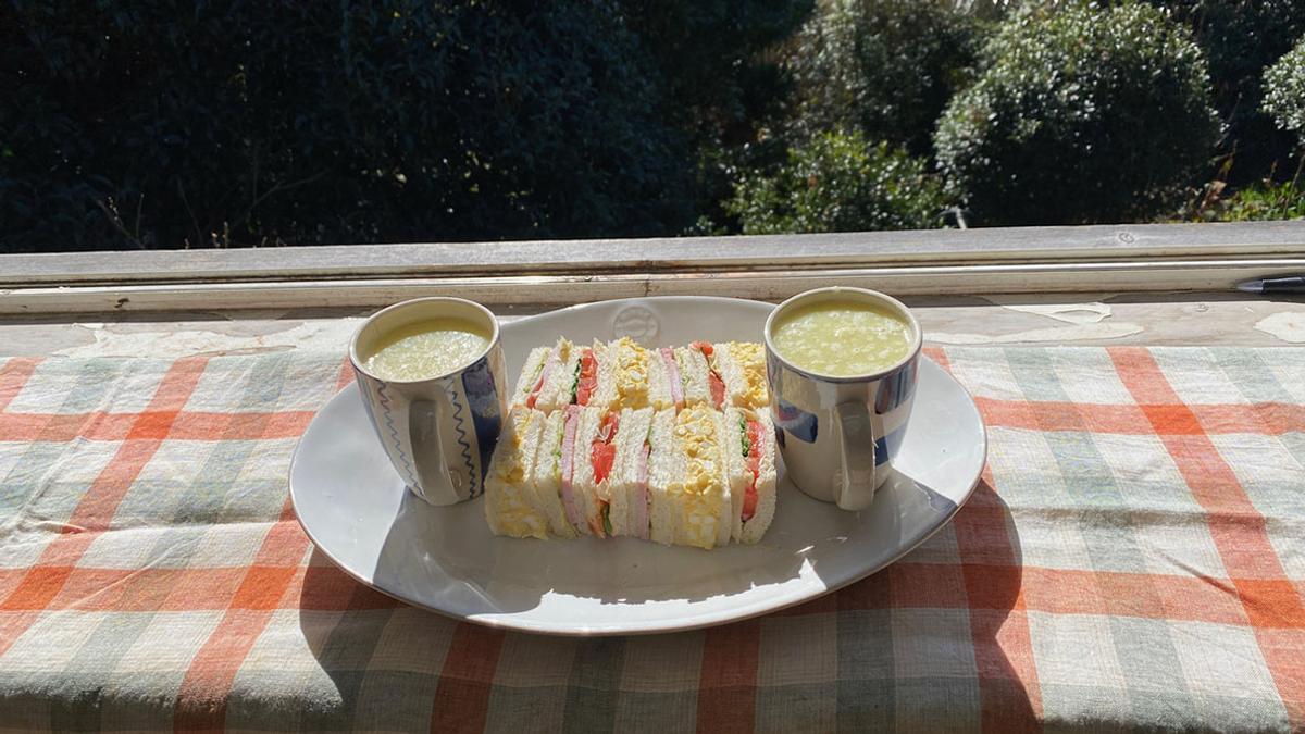 サンドイッチ(卵、ハムときゅうり、トマトとクリームチーズ)。スープ(ポテトと玉ねぎと白菜)。