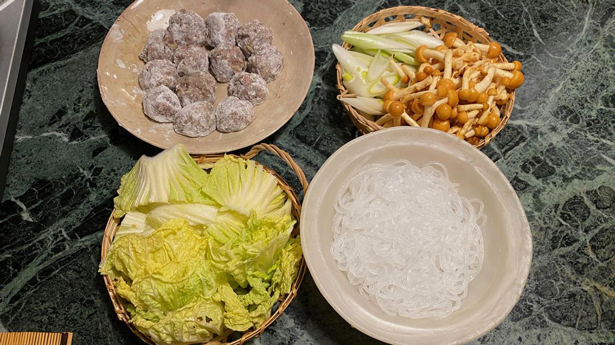 イワシのつみれ鍋(つみれ、ネギ、白菜、なめこ、春雨、ポン酢醤油で食べる)。いちご。