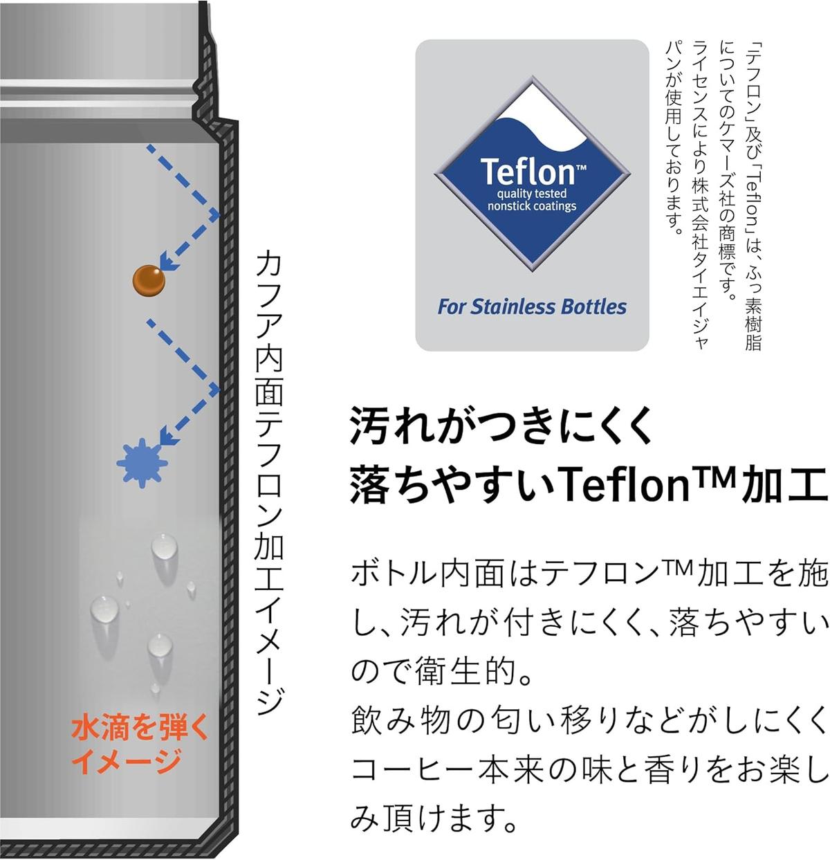 ボトル内面にはテフロン加工を施し、匂いや汚れが付きにくく落ちやすい仕様に。内瓶底はフラット形状で洗いやすく、清潔を保ちやすいのもポイントです。