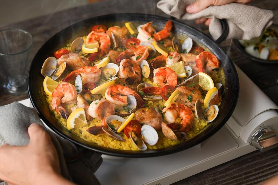 ゆとりのある幅広設計で、直径30cmまでの鍋やフライパンに対応。パエリアやすき焼き、おでん、シューマイといった蒸し料理などさまざまなレシピが楽しめますよ。