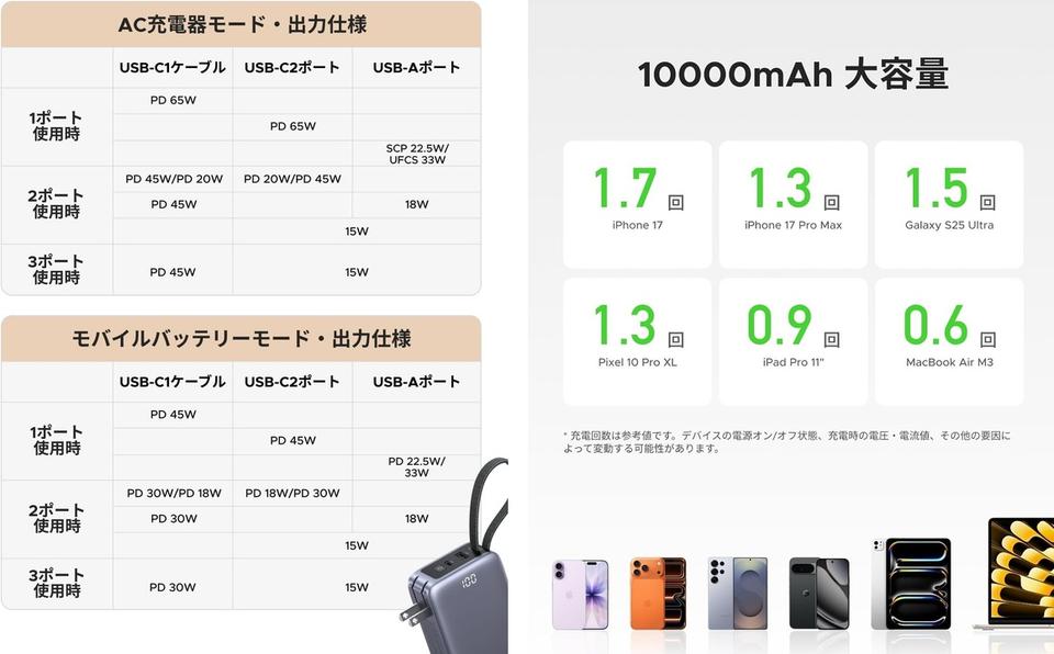出力仕様やデバイスへの充電可能回数の目安は、画像を参照してください。