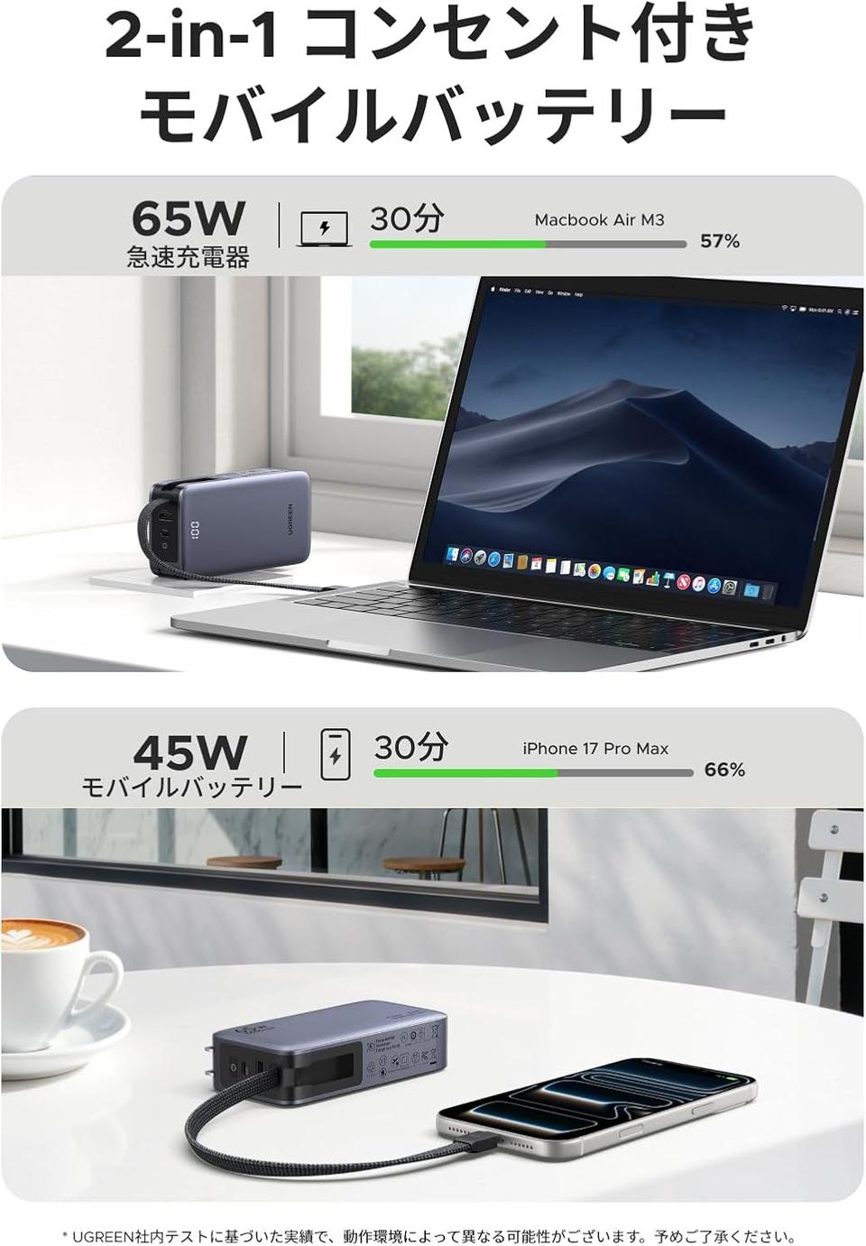 モバイルバッテリーとしての使用時でも最大45W出力を維持するため、外出先での作業も安心して行えますよ。