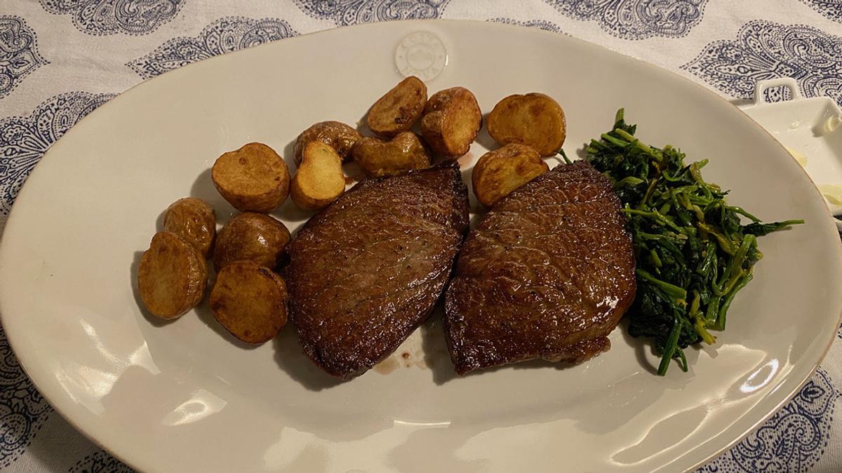 仙台牛のステーキ、フライドポテト、ほうれん草のソテー。
