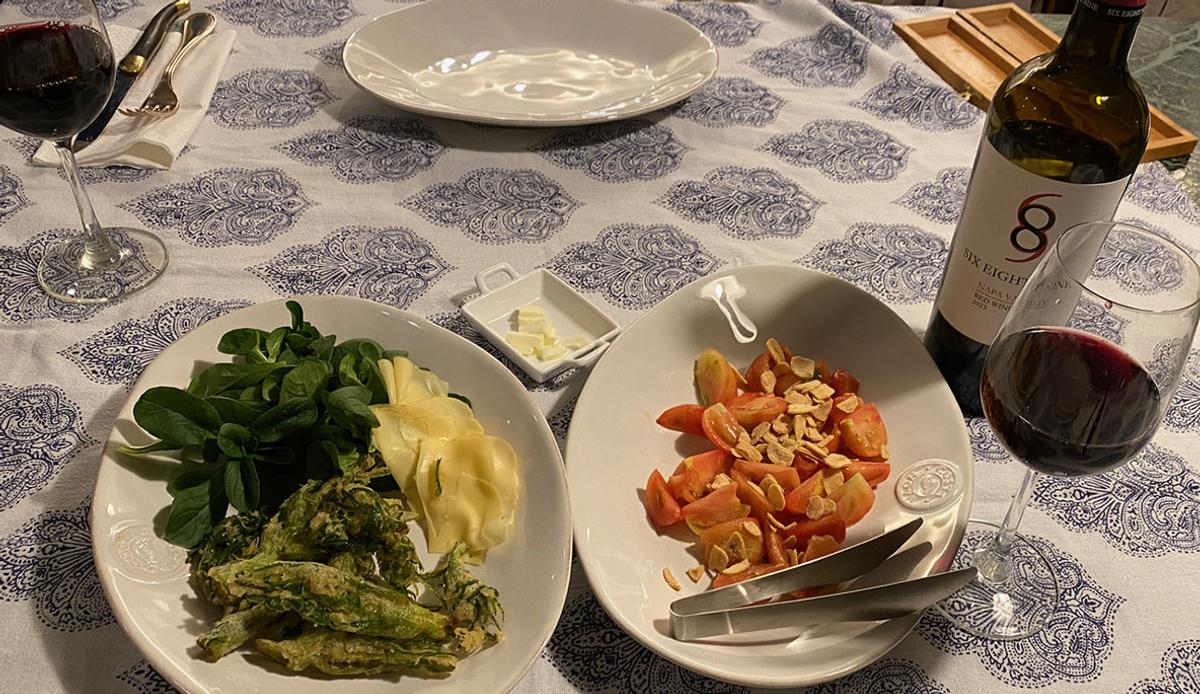 プンタレッレのフリット、チーズとマーシュ。トマトとガーリックチップ、